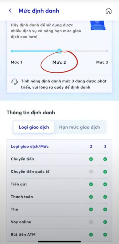 - Hạn mức 2 nó sẽ xuất hiện khi những người trên 18 tuổi và mở tài khoản online tại nhà và chưa có định danh tại ngân hàng thì những người trên 18 tuổi vẫn sẽ ở mức thứ 2 này.